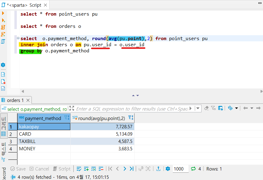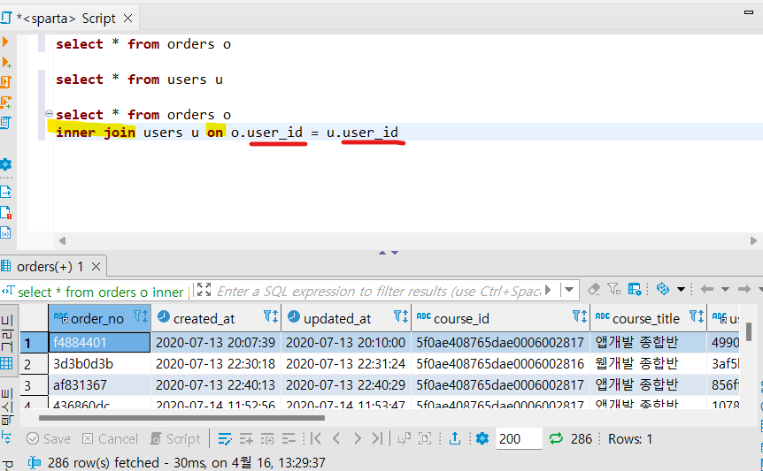 - inner join users u on o.user_id = u.user_id : users 테이블을 orders 테이블에 붙이는데, orders 테이블의 user_id와 동일한 user_id를 갖는 users 테이블 데이터를 붙입니다. (*users 테이블에 u라는 별칭을 붙입니다)