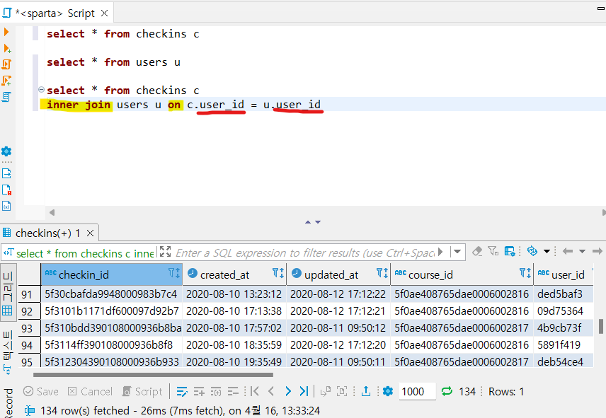 >> 기존 방식대로 하면 users 테이블 보고, checkins 테이블 따로 봐야함