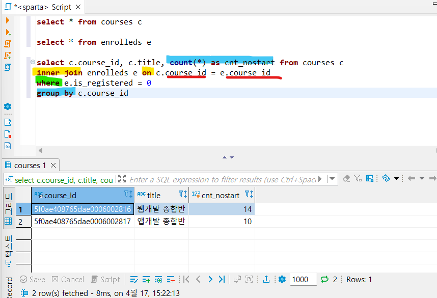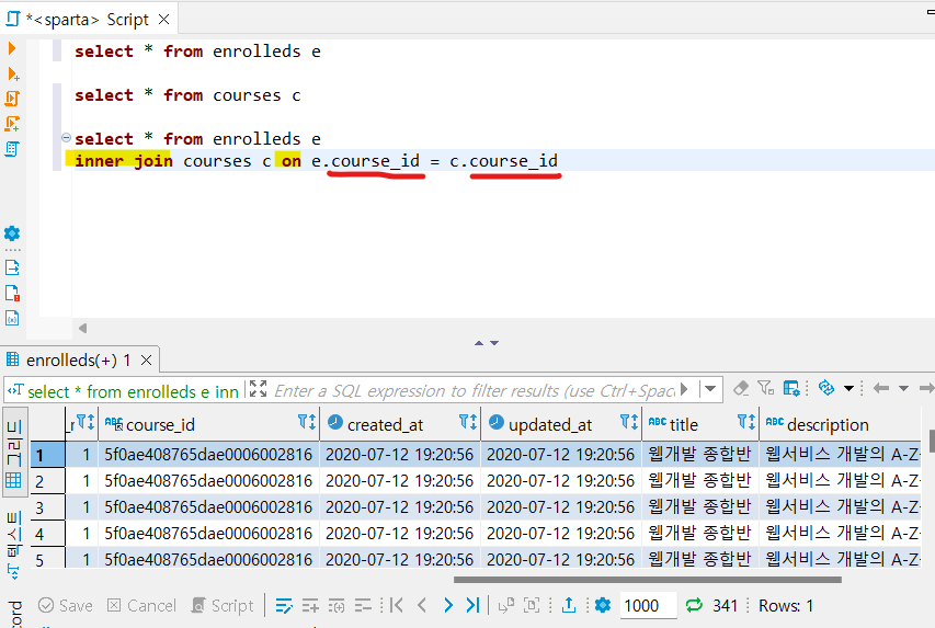 - inner join courses on e.course_id = c.course_id: courses를 enrolleds 테이블에 붙이는데, enrolleds 테이블의 course_id와 동일한 course_id를 갖는 courses의 테이블을 붙입니다.