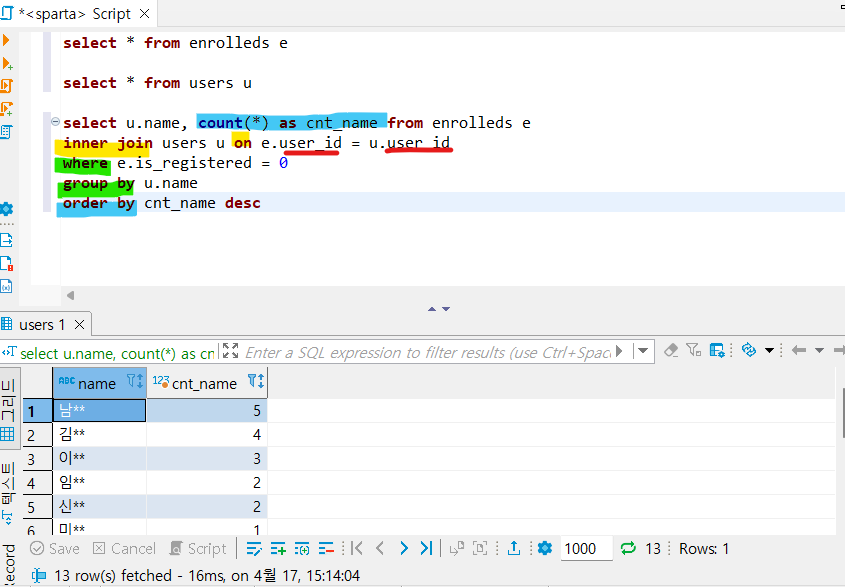 - select u.name, count(u.name) as count_name : users 테이블의 name필드와 name 필드를 기준으로 뭉쳐진 갯수를 세어서 출력해줍니다.