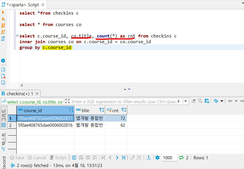 checkins 테이블에 courses 테이블 연결해서 통계치 내보기
